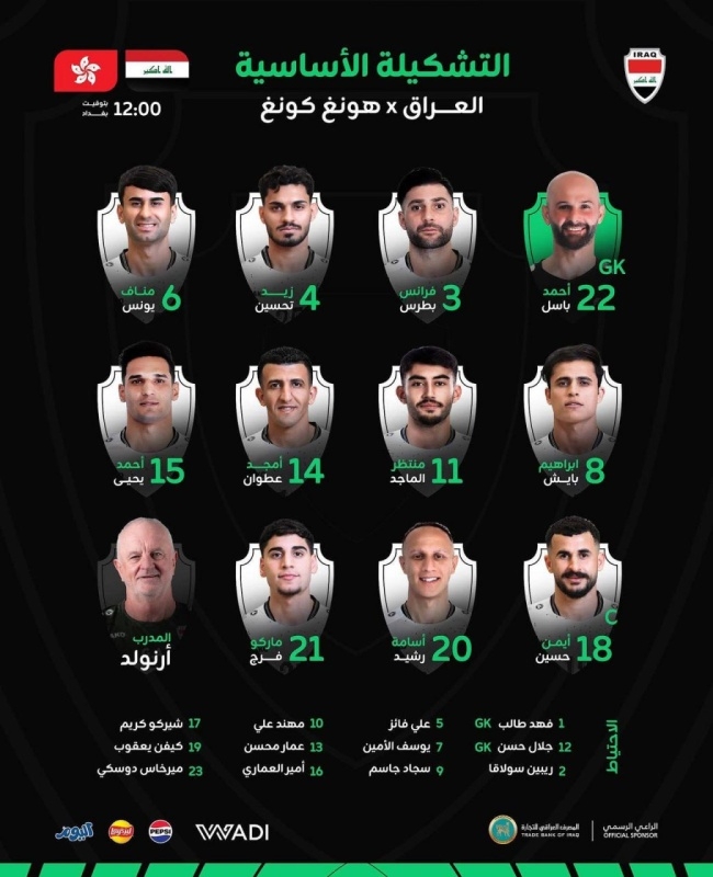 تنشر "تايتل نيوز"، اليوم الخميس (4 أيلول 2025)، التشكيلة الأساسية لمنتخب العراق لمواجهة هونغ كونغ في افتتاح منافسات كأس ملك تايلاند.